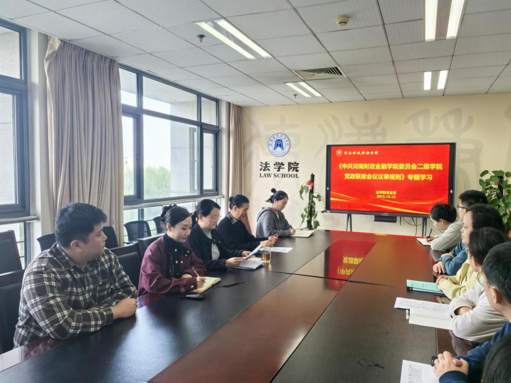 10月14日下午,法学院党总支召开专题学习会议,组织行政坐班人员集体学习《河南财政金融学院二级学院党总支委员会会议议事规则》和《河南财政金融学院二级学院党政联席会议议事规则》(以下简称《议事规则》)。会议由学院党总支书记石兰月主持。