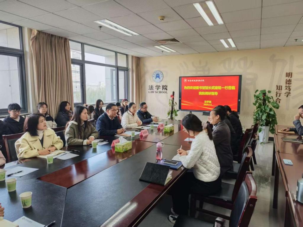 2025年11月11日下午,校图书馆馆长武建铭、副馆长张新勤、王春晖一行莅临我院展开图书馆资源建设和服务改进意见调研座谈会,法学院领导、师生代表共同参与了此次座谈会。