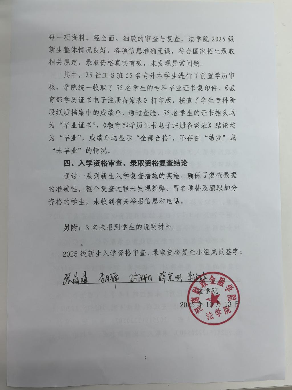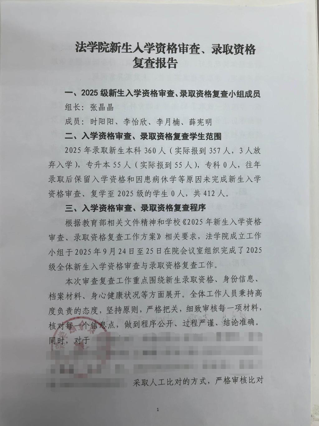 法学院新生入学资格审查、录取资格复查报告
